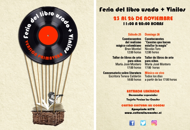 LAS CONDES (Santiago de Chile), 21 de Noviembre — 2017.- En su versión de primavera, se realizará en Las Condes la “Feria del libro usado + vinilos”, con 27 stands de libreros de viejo y disqueros, complementado con cuenta-cuentos, talleres, conversatorios y música en vivo.