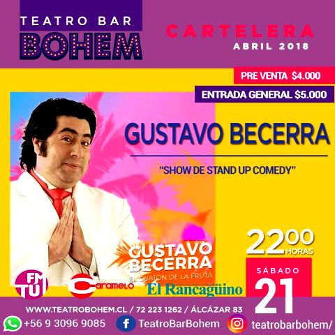 El polifacético Gustavo Becerra, vuelve a sorprender a sus seguidores con su hilarante rutina de stand up comedy. El actor, músico y comediante, se presentará este sábado 21 de abril a las 22:00 hrs. en el Teatro Bar Bohem, de Rancagua…