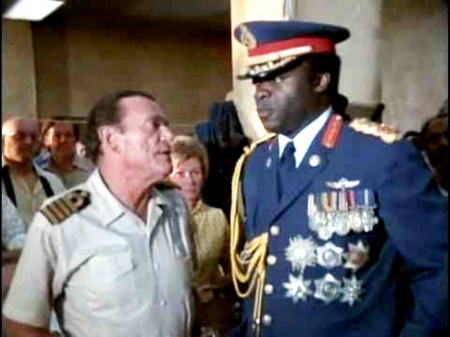 En el verano de 1976, dos extremistas alemanes y dos combatientes palestinos secuestraron un avión de Air France con 248 pasajeros a bordo, haciéndolo aterrizar en Entebbe (Uganda). Si en algún momento se pensó que Idi Amin estaba ajeno al asunto, ahora no cabe duda de que estaba de acuerdo con los terroristas, ya que está esperando junto al jefe palestino de la operación.  Pero no se le presenta como un loco, sino como un gigantón megalómano.