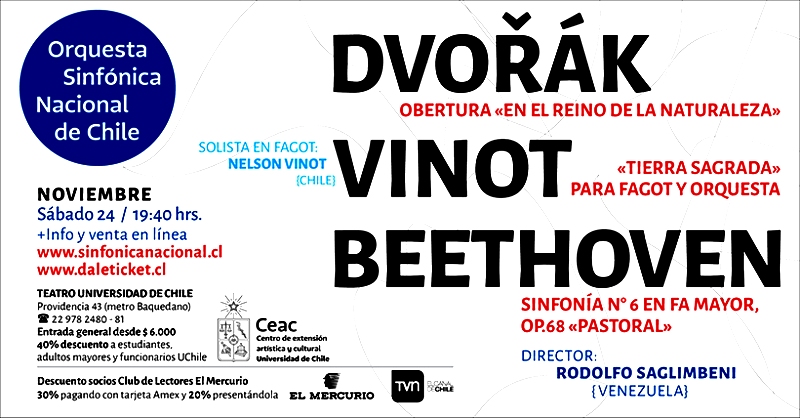Continuará Tierra Sagrada, obra para fagot y orquesta, escrita el 2017 por Nelson Vinot, fagot solista de la Orquesta Sinfónica Nacional de Chile. Este concierto marcará un hecho inédito al ser la primera vez que un miembro del conjunto estrene su propia obra. “Estoy frente a dos desafíos: por una parte la composición misma, y por otra, la interpretación”, comentó Vinot.
