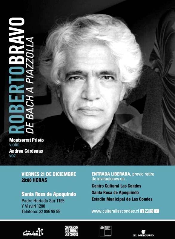 Un concierto para todo público realizará Roberto Bravo al aire libre en Santa Rosa de Apoquindo —el viernes 21 de diciembre—, uno de los pianistas más importantes de Chile y Latinoamérica, junto a la violinista Montserrat Prieto y a la cantante Andrea Cárdenas… La entrada es liberada previo retiro de invitaciones…