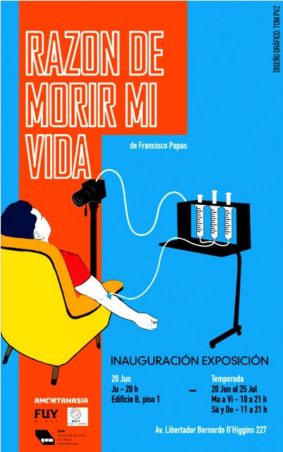 Intervención artístico – política… Información y un dispositivo para realizar eutanasia y/o suicidio asistido, son puestos a disposición del público en Razón de morir mi vida, nueva instalación del artista Francisco Papas Fritas… La exhibición, que busca concientizar al Estado para cambiar las leyes actuales, estará en la sala Espacio B del GAM, desde el 21 de junio al 25 de julio…