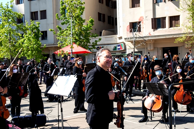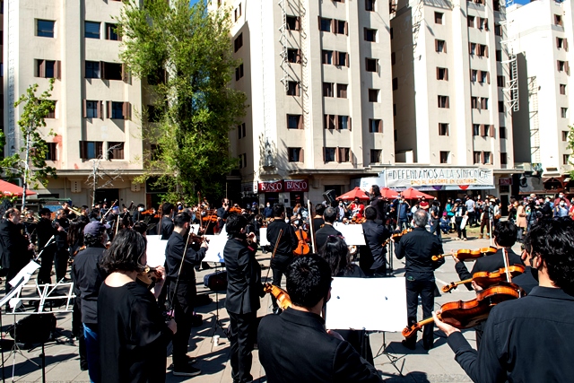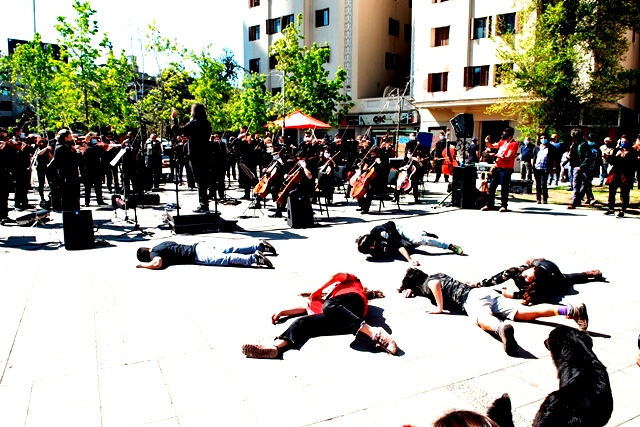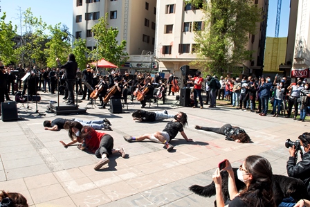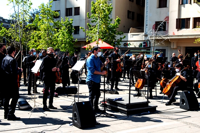 SANTIAGO (Chile), 9 de Octubre — 2020.-  Ayer jueves 8 de octubre, la Plaza Italia —rebautizada popularmente como “Plaza de la Dignidad”— se llenó de música, cantos y danzas. Unidos bajo el lema #DefendamosLaSinfónica, miembros de los cuatro elencos estables del Centro de Extensión Artística y Cultural de la Universidad de Chile, CEAC —Orquesta Sinfónica Nacional de Chile, Ballet Nacional Chileno, Coro Sinfónico y Camerata Vocal— se reunieron a l aire libre y frente a su propia casa, el Teatro Universidad de Chile.