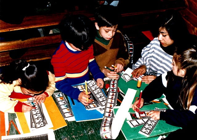 Palabras tan complicadas como “taumatropo”, “zoótropo” y “kinetoscopio” —que los adultos no entienden— son manejadas por estos casi analfabetos que aprenden a confeccionarlos y a utilizarlos. Lo mismo dígase de un “travelling” realizado sobre una carretilla. La última actividad será ir al centro de Santiago para ver “cine de verdad”.