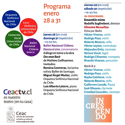 El director artístico del Ballet Nacional Chileno, Mathieu Guilhaumon, repasará una de sus creaciones, junto a la primera bailarina del Ballet de Santiago, Romina Contreras, y los músicos de la Orquesta Sinfónica Nacional de Chile, Luis Alberto Latorre y Miguel Ángel Muñoz… En tanto, la música en vivo llegará de la mano de dos ensambles mixtos que darán vida a Ocho por radio y Batik R.9, del compositor mexicano Silvestre Revueltas…