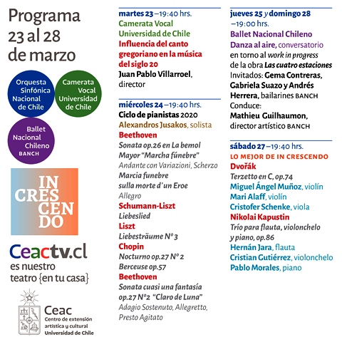 SANTIAGO (Chile), 23 de Marzo — 2021.- Tras la suspensión momentánea de las transmisiones en directo de “Ceac TV” como medida de prevención ante las altas cifras de contagio por Covid-19, el canal online del Centro de Extensión Artística y Cultural de la Universidad de Chile continúa presentando algunos de sus atractivos contenidos con registros anteriores que incluyen lo mejor de “In Crescendo”, ciclos de piano y conciertos corales, además de un nuevo capítulo de “Danza al aire”.