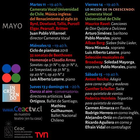 Por su parte, la música llegará a www.ceactv.cl con una nueva revisión de lo mejor de “In Crescendo”, que este viernes 14 a las 19:40 horas presentará tres voces de la Camerata Vocal de la Universidad de Chile, conjunto dirigido por el maestro Juan Pablo Villarroel. Partirá el barítono Arturo Jiménez, acompañado del pianista Pablo Morales, quienes darán vida a Canciones de Don Quijote a Dulcinea, de Maurice Ravel. Luego será el turno de la soprano Nora Miranda junto al solista en piano de la Orquesta Sinfónica Nacional de Chile, Luis Alberto Latorre, interpretando Sieben frühe Lieder de Alban Berg.