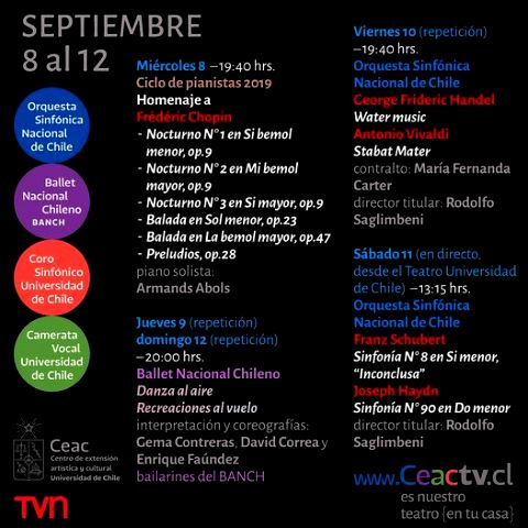 En tanto, el jueves 9 y domingo 12 de septiembre a las 20:00 horas, el Ballet Nacional Chileno llegará a las pantallas representado por tres bailarines que conforman sus filas: Gema Contreras, David Correa y Enrique Faúndez, en una revisión de lo que fue uno de sus episodios de “Danza al aire”, presentando creaciones de sus bailarines en “Recreaciones al vuelo”.