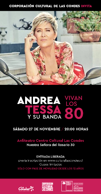LAS CONDES (Santiago de Chile), 19 de Noviembre — 2021.-   Con un programa de temas de Donna Summer, Lionel Richie, Gloria Gaynor, Stevie Wonder, Elton John y Burt Bacharach, entre otros, la cantante Andrea Tessa y su banda ofrecen el sábado 27 de noviembre, a las 20:00 horas, VIVAN LOS OCHENTA, un entretenido y nostálgico concierto al aire libre, en el Anfiteatro y jardines del Centro Cultural Las Condes, Apoquindo 6570. Para acceder al espectáculo se debe contar con Pase de Movilidad habilitado e inscripción previa en www.culturallascondes.cl.