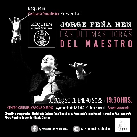 La Compañía RÉQUIEM nació el año 2016, junto con el aniversario número 10 de su directora en la técnica del Butoh. Ese mismo año se estrenó «Las últimas horas del Maestro», en La Serena. Posteriormente ha tenido funciones en diversas comunas de Santiago, en el norte de Chile y en Argentina. Paralelamente, esta obra cuenta con una versión inmersa en el cine internacional para la película «Love & Justice», la cual será estrenada este año 2022 en Nueva York, y con el Fotolibro «Caravana de Jorge Peña en tierra tarapaqueña», el primer Fotolibro de Butoh en Chile, el cual se encuentra a la venta por la misma Compañía.