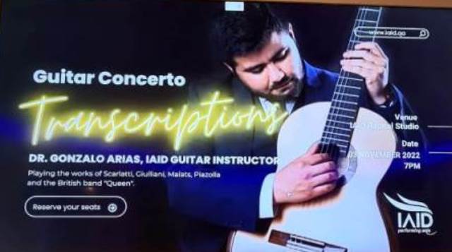 El concertista clásico chileno, Gonzalo Arias Contreras —oriundo de Los Andes—, presentará un recital inédito en guitarra llamado «Transcriptions», previo a la Copa del Mundo FIFA Qatar 2022… El concierto se realizará el día 3 de noviembre a las 20:00 hrs en la Sala de Honor de la Academia de Artes IAID…