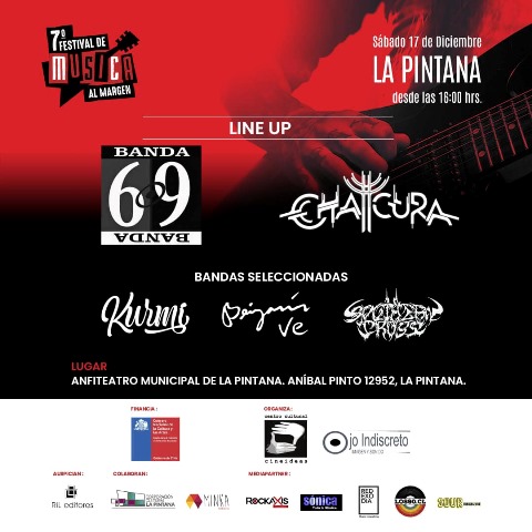 Este sábado 17 de diciembre se realizará un nuevo encuentro de Música al Margen, que por séptima vez busca premiar a músicos emergentes de la Región Metropolitana, dándoles la posibilidad de tocar en un festival y grabar un EP… El evento es gratuito y se realizará en el Anfiteatro de La Pintana (Anibal Pinto #12952) desde las 16:00 horas… En el evento también se presentarán las agrupaciones ya consolidadas, Chaicura, y la legendaria Banda 69, liderada por Robert Rodríguez…