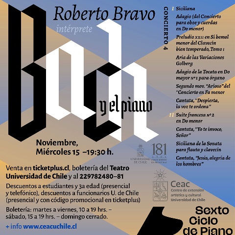 El connotado intérprete nacional ofrecerá el cuarto de la serie de cinco conciertos dedicados íntegramente a la obra de Johann Sebastian Bach, presentándose este miércoles 15 de noviembre en el espacio cultural ubicado frente a la salida del metro Baquedano…
