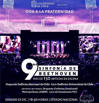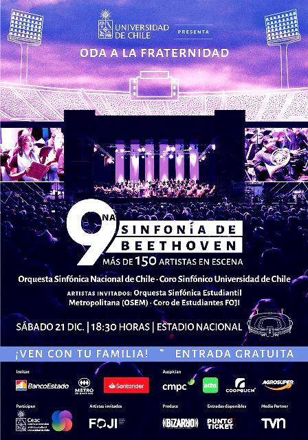 Novena Sinfonía de Beethoven, gratis, el próximo 21 de diciembre… La Orquesta Sinfónica Nacional de Chile junto al Coro Sinfónico Universidad de Chile interpretarán esta monumental obra, bajo la dirección de Rodolfo Saglimbeni… Este magno concierto sinfónico —el más grande de la historia en el país—, será transmitido por la señal de TVN… Las entradas se encuentran disponibles en Puntoticket…