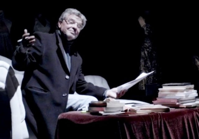 La puesta en escena es difícil de clasificar, ya que combina ficción con documental y actuación en directo con proyección de antiguas películas y fotografías.